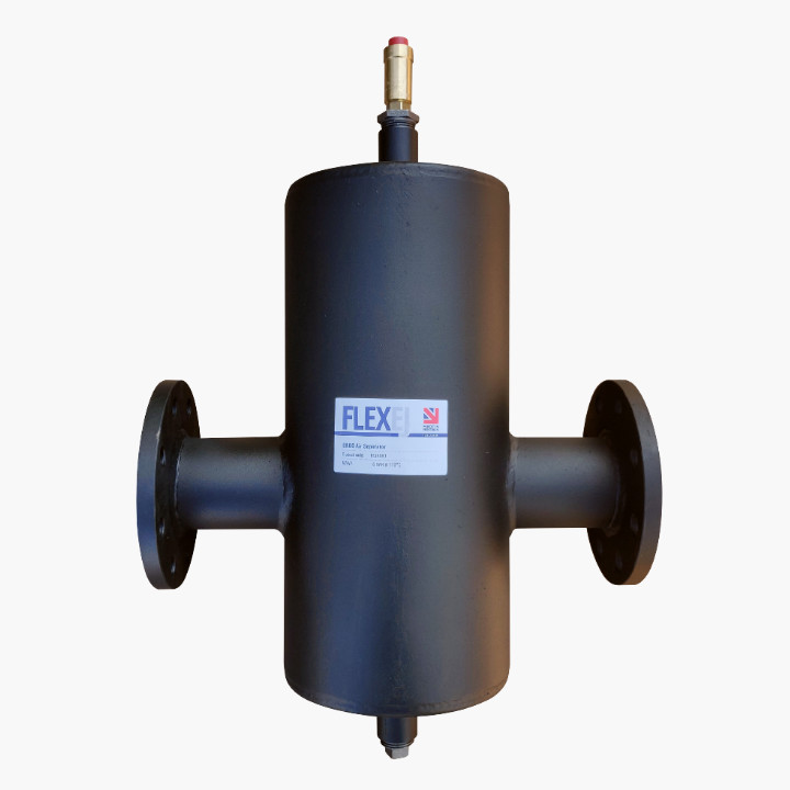 DN80 FlexEJ Air separator for HVAC systems with stainless steel air bubble coalescing brush and Flamco Flexvent AAV plus drain plug. Manufactured in our factory in the UK.
