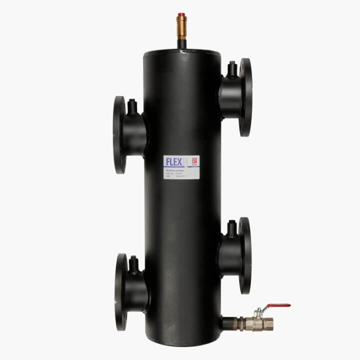 DN100 FlexEJ Low Loss Header nominal power rating – boilers 790 kW (@ 20 °C ΔT) / heat pumps 198 kW (@ 5 °C ΔT). For HVAC systems with plugged tapping on all branches, Flamco Flexvent AAV plus DN 25 drain valve. Manufactured in our factory in the UK. Contact sales for different ratings, connections and selection advice – we will be pleased to quote any low loss header size or configuration you may require.