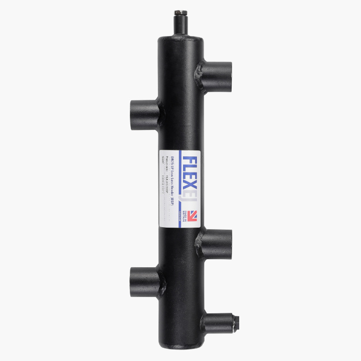 DN25 FlexEJ Low Loss Header nominal power rating – boilers 50 kW (@ 20 °C ΔT) / heat pumps 13 kW (@ 5 °C ΔT). For HVAC systems with single thermowell and plugged vent / drain. Manufactured in our factory in the UK. Contact sales for different ratings, connections and selection advice – we will be pleased to quote any low loss header size or configuration you may require.