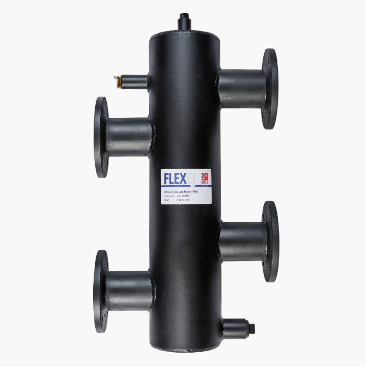 DN65 FlexEJ Low Loss Header nominal power rating – boilers 280 kW (@ 20 °C ΔT) / heat pumps 70 kW (@ 5 °C ΔT). For HVAC systems with single thermowell and plugged vent / drain. Manufactured in our factory in the UK. Contact sales for different ratings, connections and selection advice – we will be pleased to quote any low loss header size or configuration you may require.