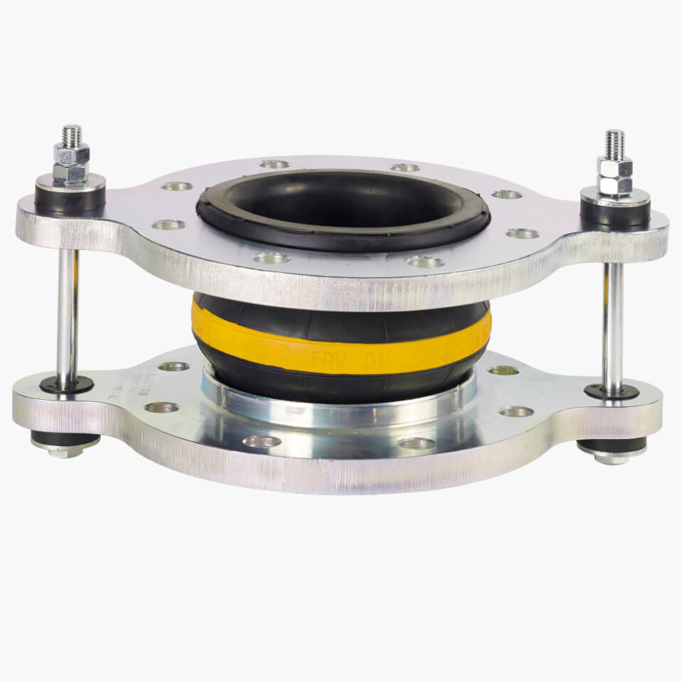 DN125 Elaflex Flanged Tied Rubber Bellows – YellowBand – Nitrile – petroleum based products, fuels, natural gas – for pipe expansion, misalignment and vibration. Very high quality rubber bellows made in Germany. Contact sales for our full range of flanges, rubber types and lengths for Elaflex rubber bellows.